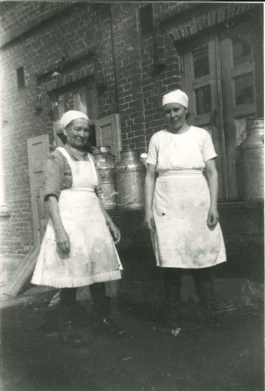 Laina-meijerska (oikealla) ja meijeriapulainen Lyyli Virtanen, kuva Pirkko Huovilainen.