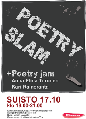 Hämeenlinnassa järjestettiin ensimmäinen Poetry Slam eli lavarunoustapahtuma 17.10.2009 Suisto-klubilla. Tapahtuman tuottivat yhteistyössä Kanta-Hämeen Lausujat ja Vana -66 ry. Runoilija osallistuu kilpailuun yksin ja runojen on oltava esittäjän omia. Esitys saa kestää 3 minuuttia. Tuomaristo valitaan yleisön joukosta. Vuoden 2009 Poetry Slamissa voiton vei janakkalalainen Kaarina Svetloff.