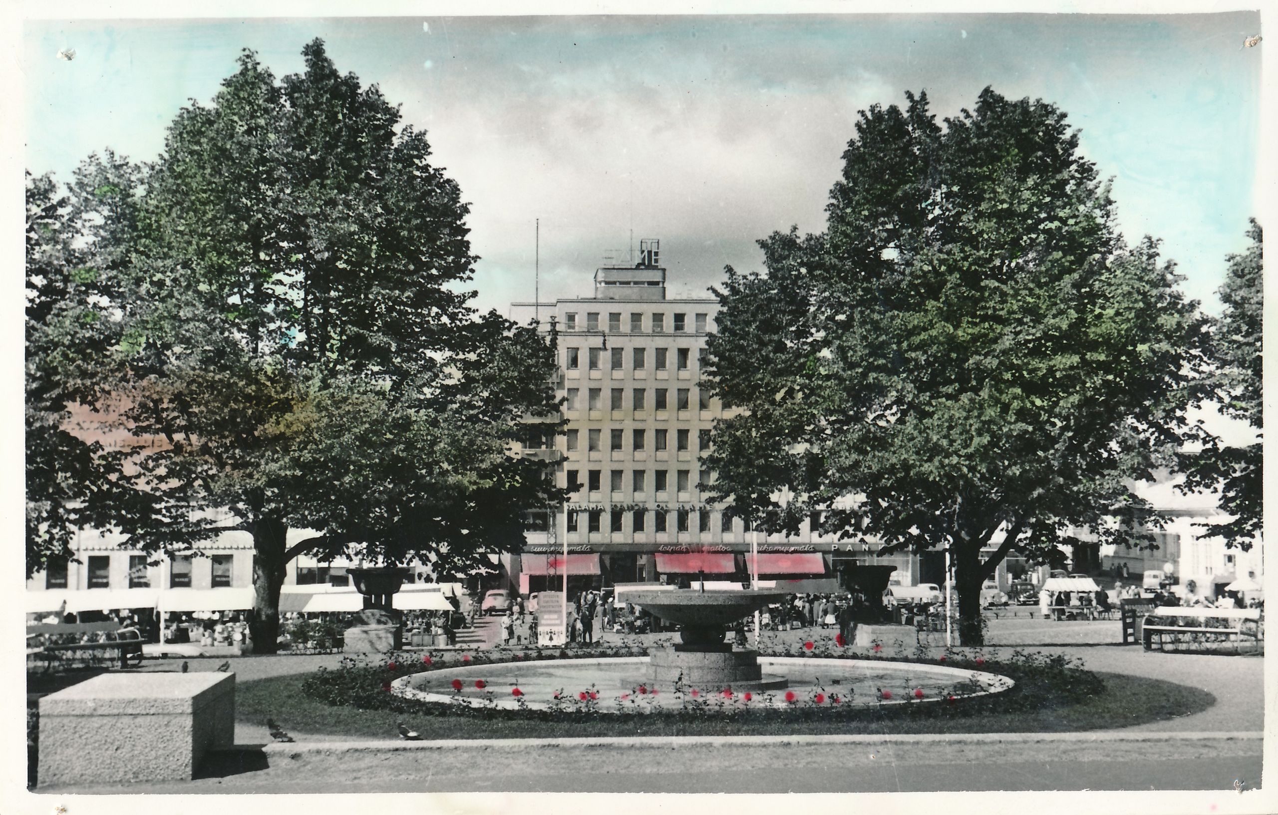 Postikortti Toripuistosta. Taustalla näkyvät Suomen maanviljelijäin kauppa, osuusliike Hämeen-Maan kauppa, Marja-Liisa Suomalaisen alusvaateliike sekä HOP-pankki.
